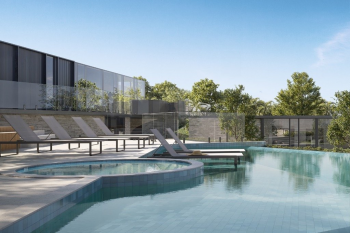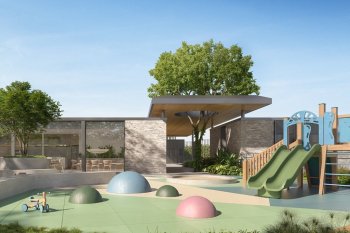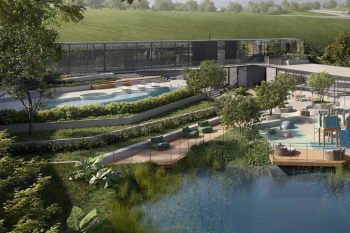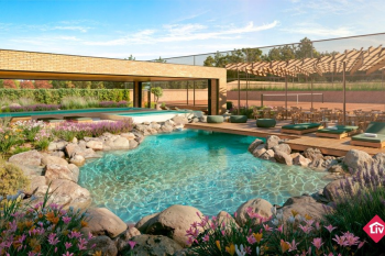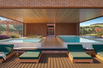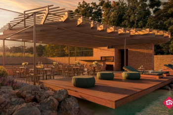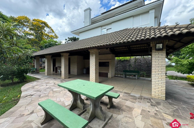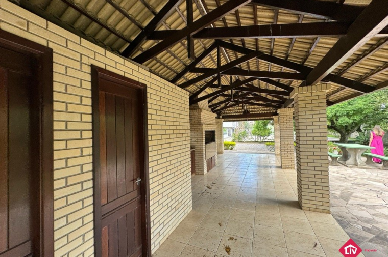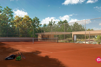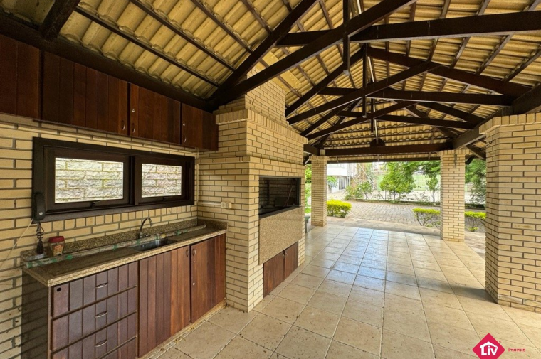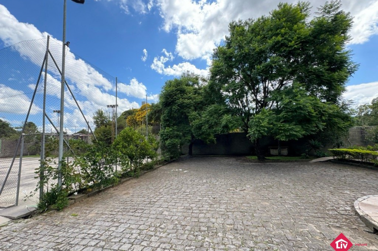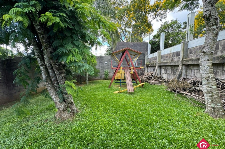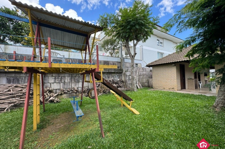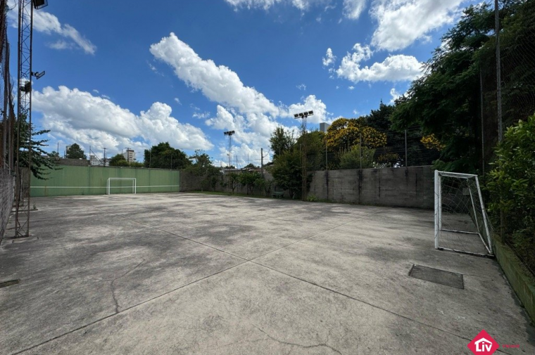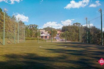 Espera para guarita, quadra de futebol, playground e quiosque com churrasqueira.